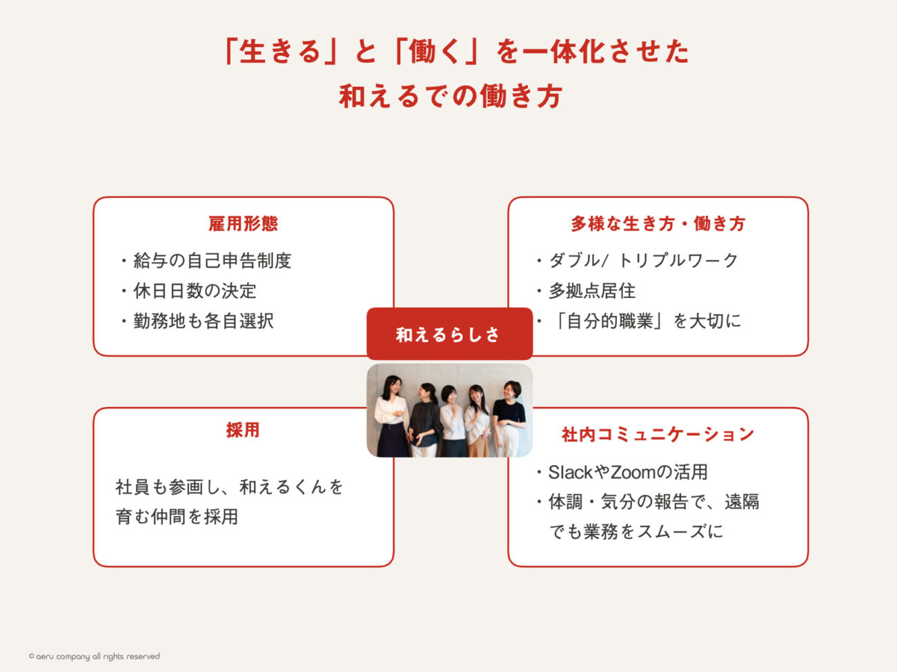 和えるの事業紹介とともに、私たちが大切にしている価値観を、ウェルビーイングに生き働く社員の実践例を交えながらお伝えしました。
