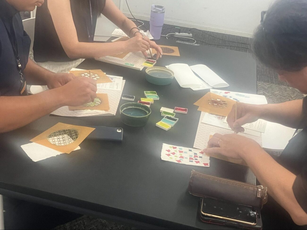 伊勢型紙・刷毛・和紙・顔彩などのお道具に触れながら、染めの技法を用いたアート作品を制作。ご自身を見つめ直し、感じたことを自由に表現いただきました。制作中は会場が静けさに包まれ、皆様が没頭する姿が印象的でした。